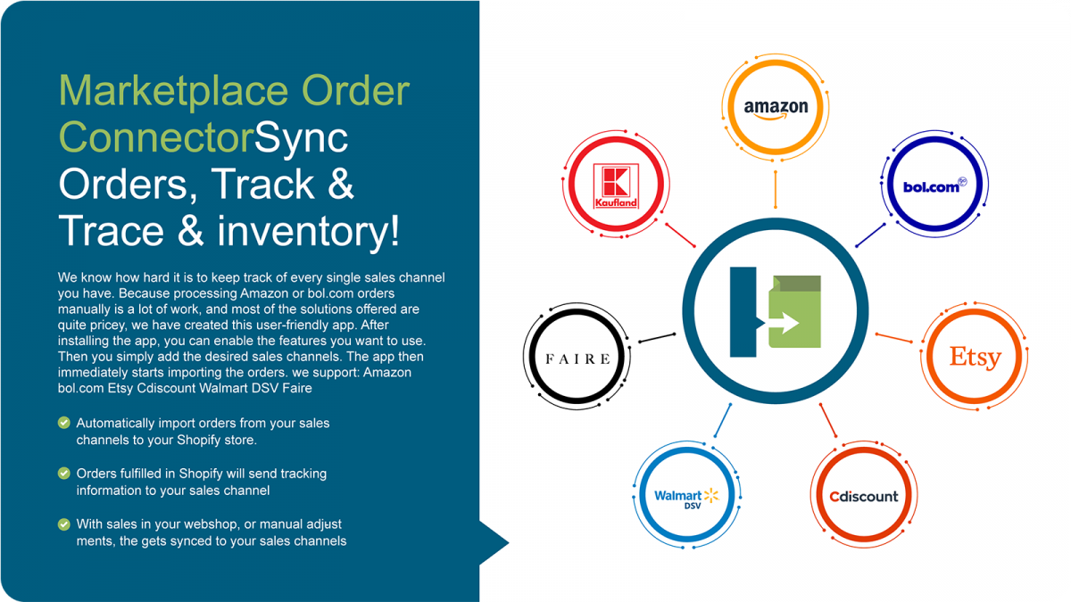 As a Shopify store owner, diversifying your business across multiple marketplaces such as Amazon, Bol.com, Cdiscount, Faire, Walmart DSV, and even Etsy or Kaufland can be a rewarding strategy. Yet, managing orders from these varied platforms can be a daunting task due to its time-consuming nature and susceptibility to errors.